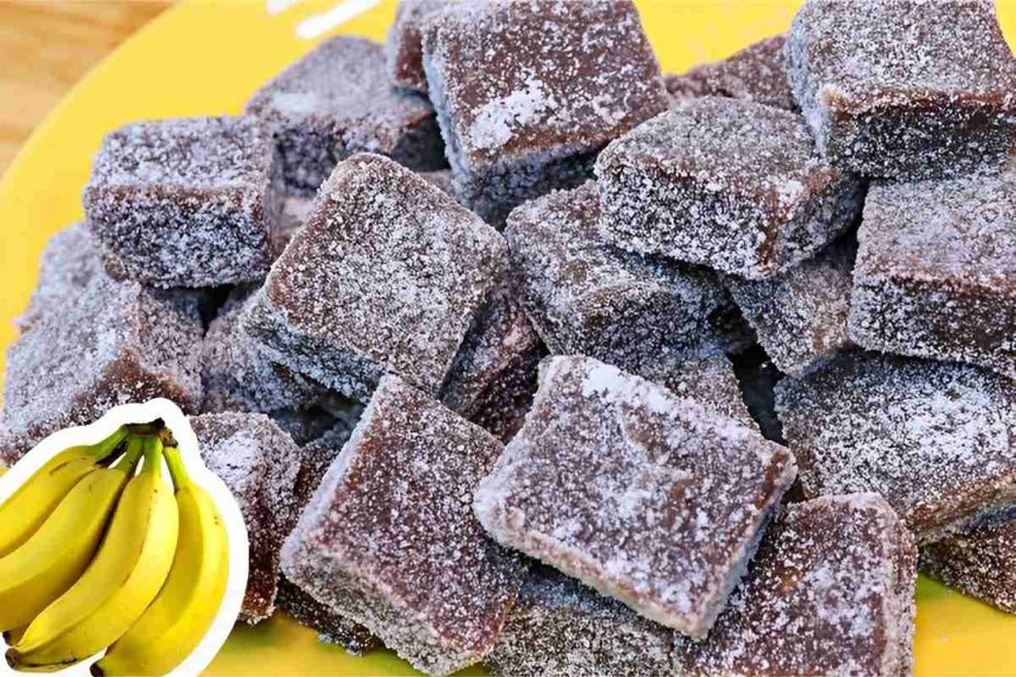 - Passe os quadradinhos no açúcar, e está pronto para servir. Agora, é só apreciar esta deliciosa bala de banana.
