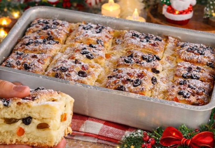 Este bolo é perfeito para o Natal e o Ano-Novo. Ele lembra o sabor tradicional do panetone, fica macio, úmido e já sai do forno com o recheio cremoso no interior, sem necessidade de rechear depois. Uma receita prática, bonita e muito saborosa, ideal para servir na ceia, no café da manhã ou até para presentear.