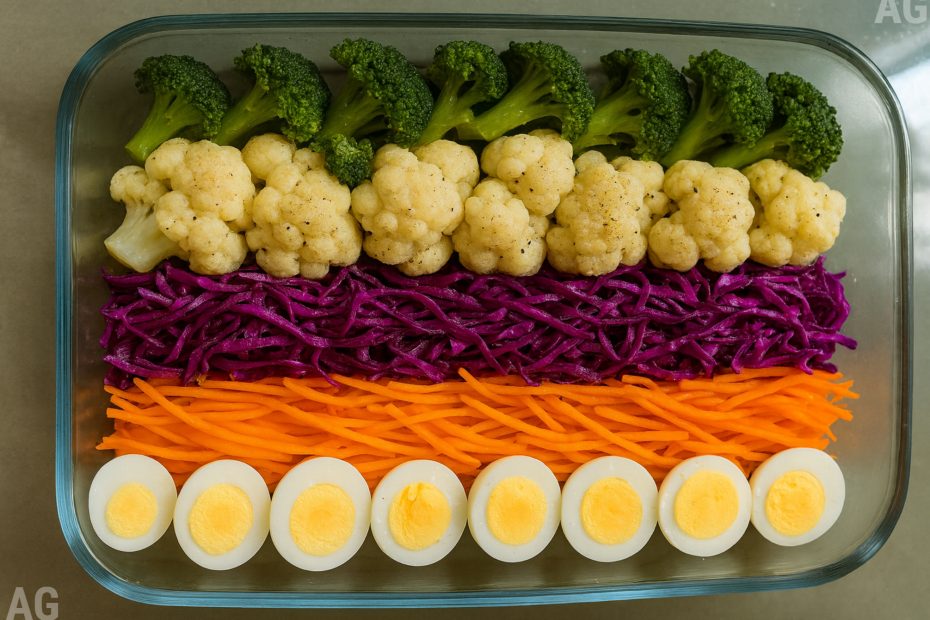 Montagem: Em uma travessa, disponha os ingredientes em faixas paralelas: repolho, cenoura, brócolis, couve-flor, abóbora e os ovos de codorna.
